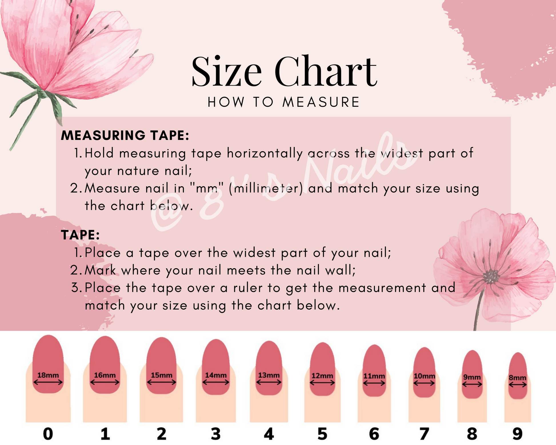 Please make sure to measure your nails accurately. We DO NOT accept cancelation for sizing/length problems. The standard sizes are just for reference. We strongly recommend measuring your nails and using the CUSTOM SIZE in order to acquire the perfect fit. If you're still unsure about your measurements, we recommend going up on the size because you can always file them down after.