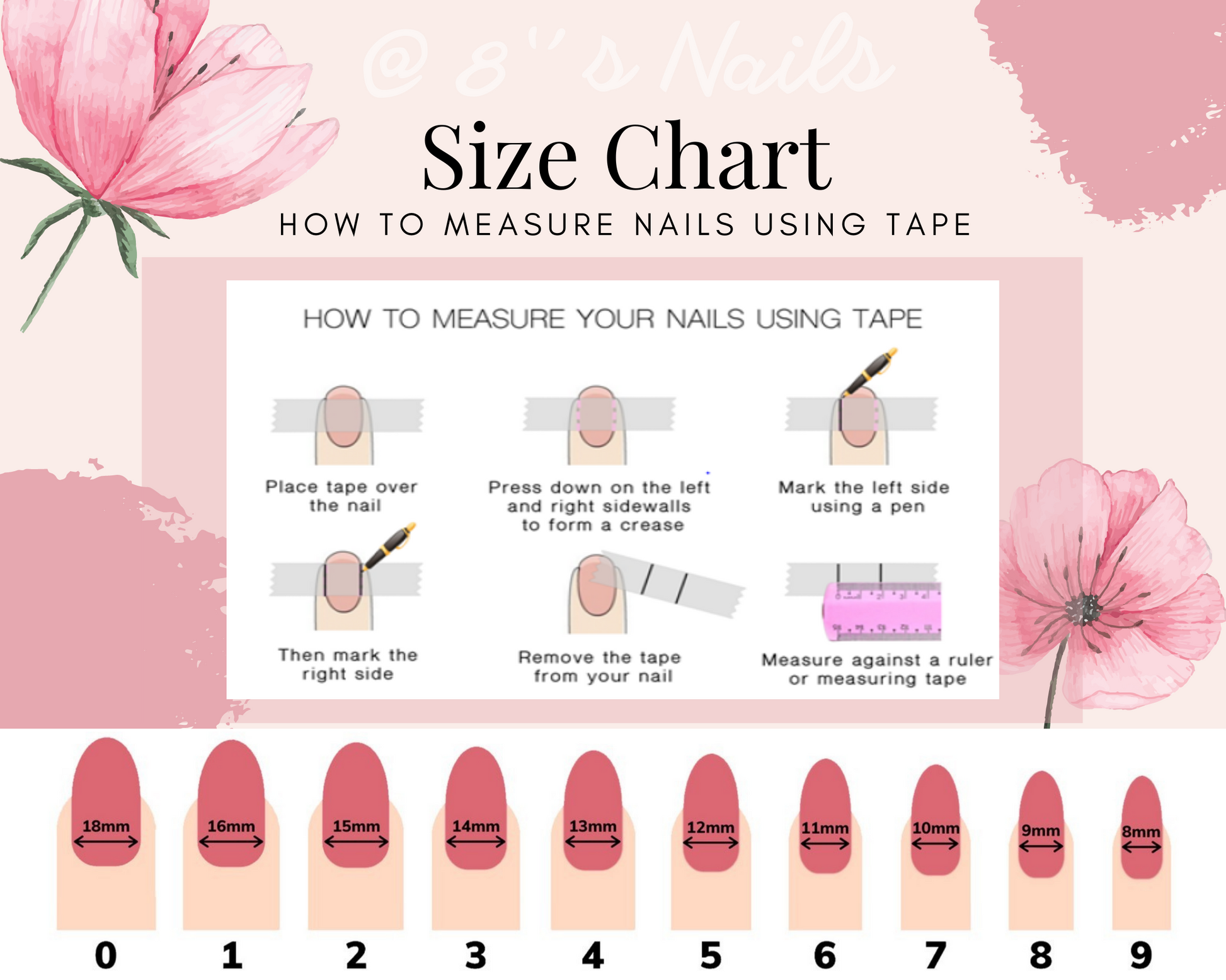 Please make sure to measure your nails accurately. We DO NOT accept cancelation for sizing/length problems. The standard sizes are just for reference. We strongly recommend measuring your nails and using the CUSTOM SIZE in order to acquire the perfect fit. If you're still unsure about your measurements, we recommend going up on the size because you can always file them down after.