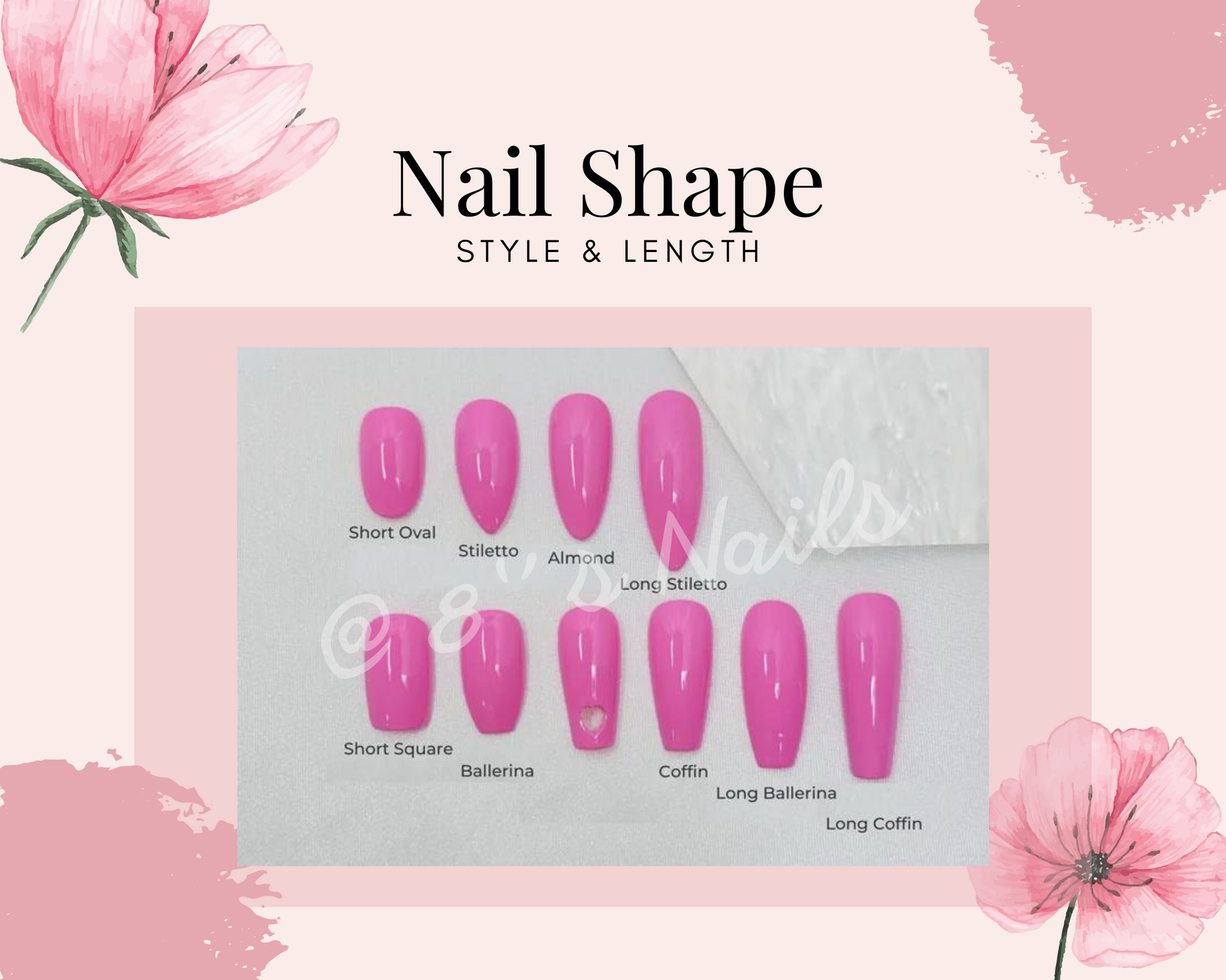 8'' s Boutique promotes high quality hand-painted nails. We also welcome any new ideas and customization as you like. We can always work together to create new designs or nail sets if you have something in mind. Please don't hesitate to contact us if you need any customization.